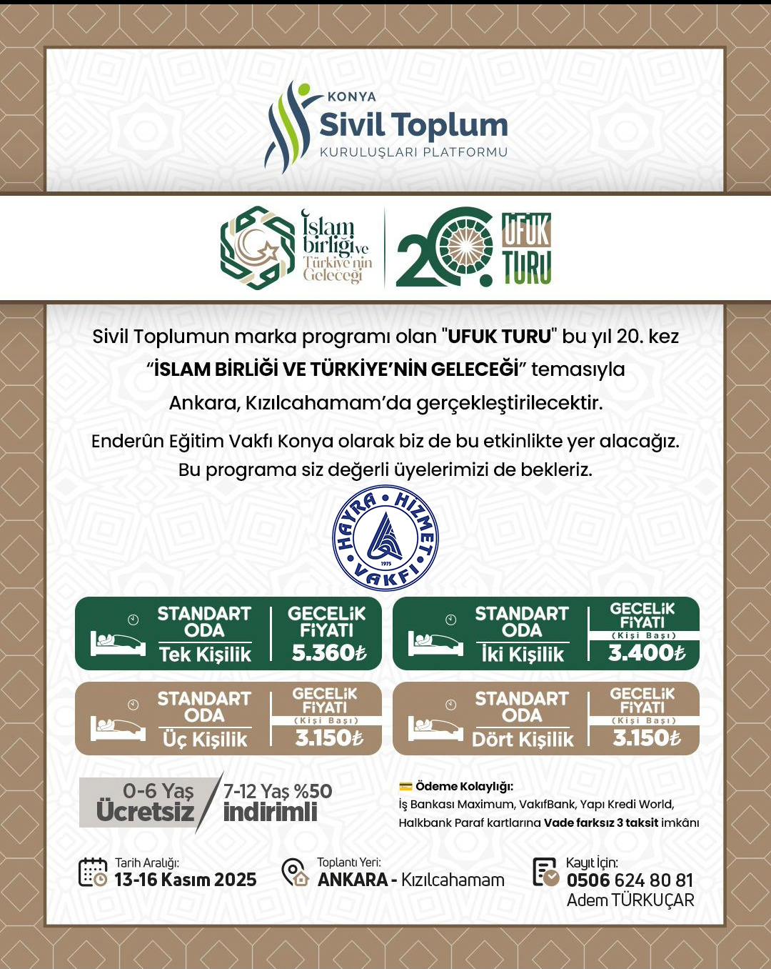 STK Konya Platformu'nun her yıl düzenlediği, yurtiçinden ve yurtdışından akademisyenler, kanaat önderleri, alimler, sivil toplum ve İslami medya temsilcileri gibi önemli katılımcıları davet ederek düzenlemiş olduğu "20. UFUK TURU" programı aşağıda verilen bilgiler ile düzenlenecektir.